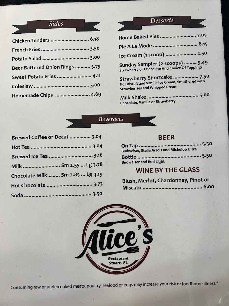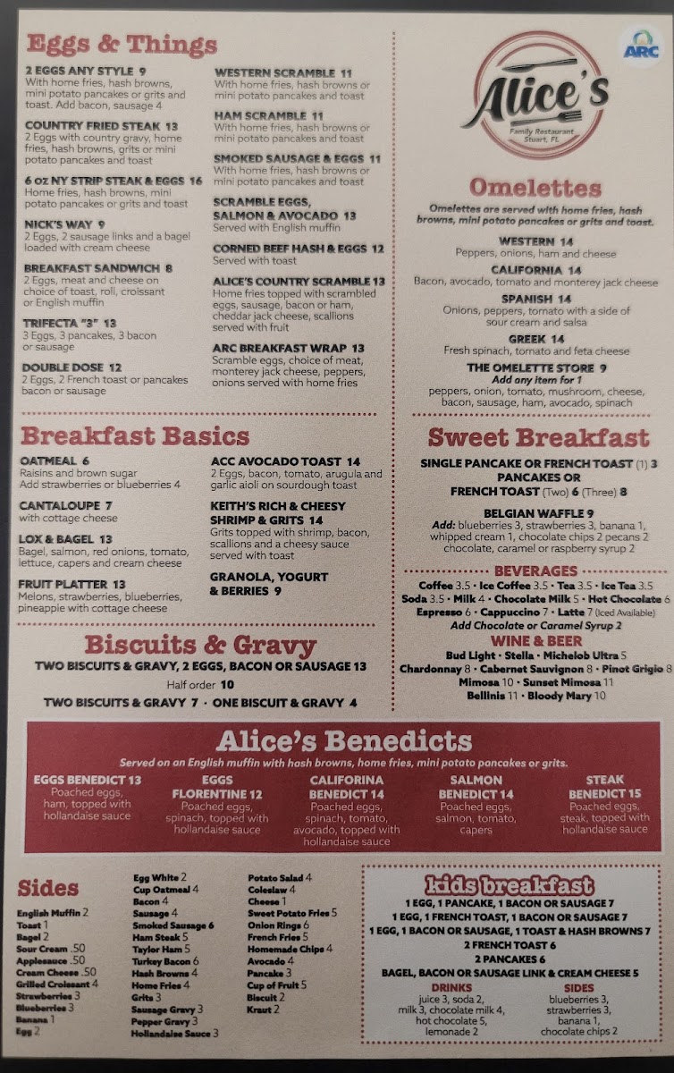 Welcome to Alice's Family Restaurant, a cherished gem located at 2781 SE Ocean Blvd, Stuart, FL. This beloved eatery invites you to indulge in a delectable menu that ranges from delightful breakfast offerings to satisfying lunch specials.